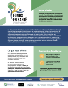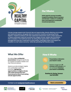 The Canadian Coalition for Green Health Care is leading a two-year initiative (2025-2027) to empower hospital foundation boards across Canada to learn and build capacity to integrate sustainable investment practices and align the capital they manage with their foundation’s health-focused missions. With expert guidance and tools created by a community of practice, board members and decision-makers will gain access to essential resources to discern and integrate environmental, social, and governance (ESG) factors into their investing practices.